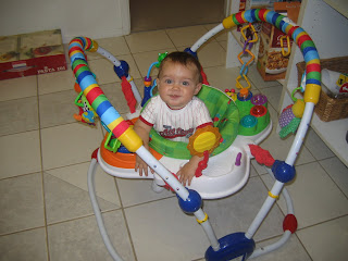 Here is a note to readers with younger kiddos than Jaden. DO NOT allow your kid to do this!!!!!! You will be amazed at his/her ability, grab the camera and in trying to get a good picture, he/she will look at you, lose their balance and promptly fall and smack their head on the floor. Trust me, it's not worth it! (PS, despite the tumble that caused a few tears, Jaden is just fine - thankfully, it was a very short box!)Jaden is enjoying the bouncer more these days. Every once in a while he'll really get bouncing and it's SO funny! This is about the only way I get dinner made or the dishes done!